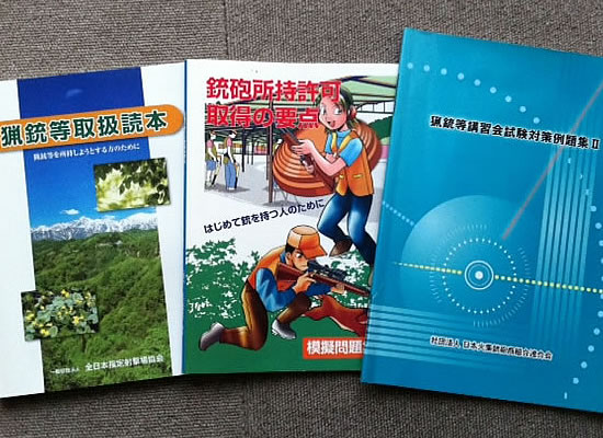 講習会午後からの試験、これが本番。これに合格しないと猟銃は手に入らないのです。猟銃等取扱読本は正規テキストだけあって、関係法令などすべてが載ってはいるものの、それだけに覚えるべき量が膨大で、要点もまとまっていません。はっきり言って僕のような物覚えの悪い人間には覚えきれません! ということで、ネットで当たりをつけていた試験用の別売テキストを2冊取り寄せました。まん中の「銃砲所持許可取得の要点」は猟銃等取扱読本の内容のうち、重要なところをまとめたもの。そして右の「猟銃等講習会試験対策例題集Ⅱ」は、言うなれば過去問。以前に出題された試験問題を分析し、今後出題されそうな形に再構成して模擬試験の形にしてあるものです。
